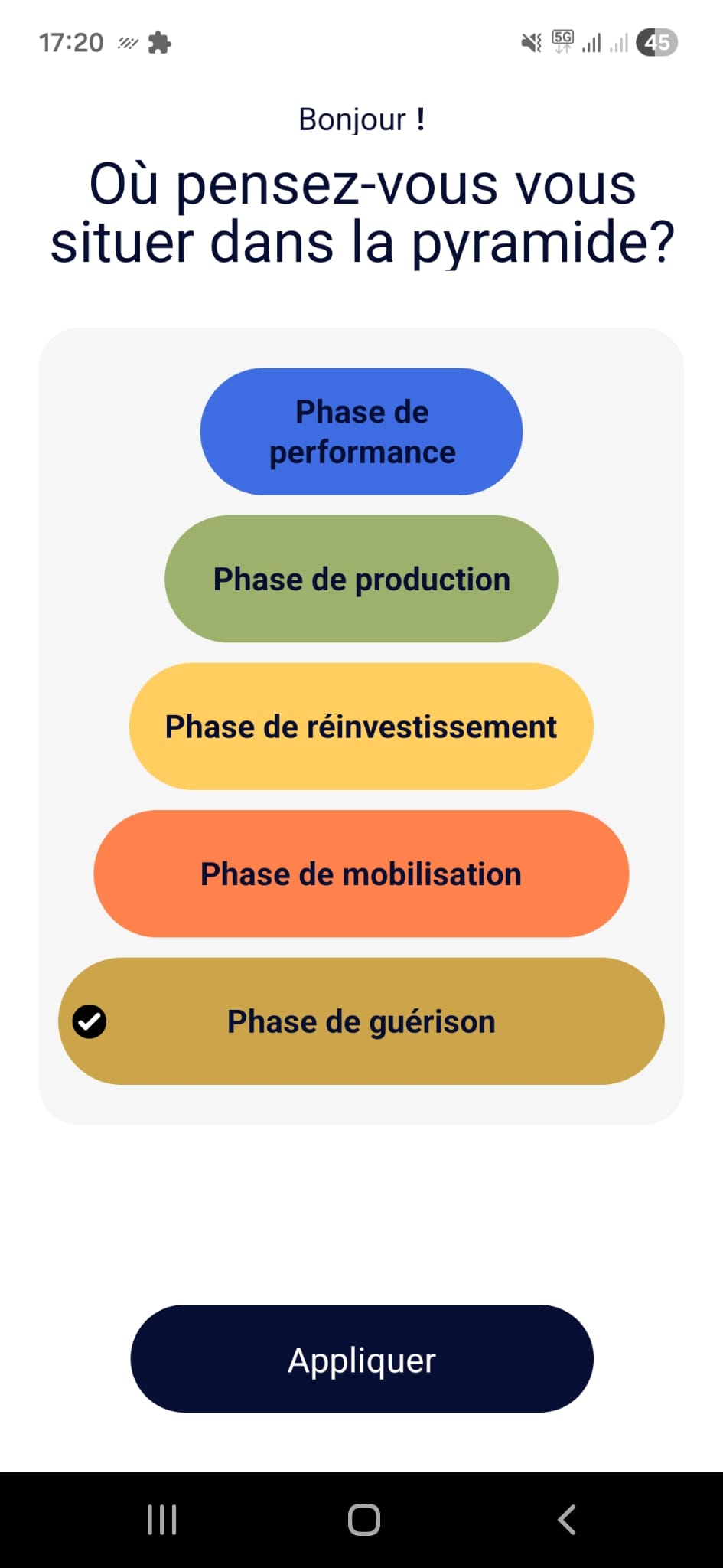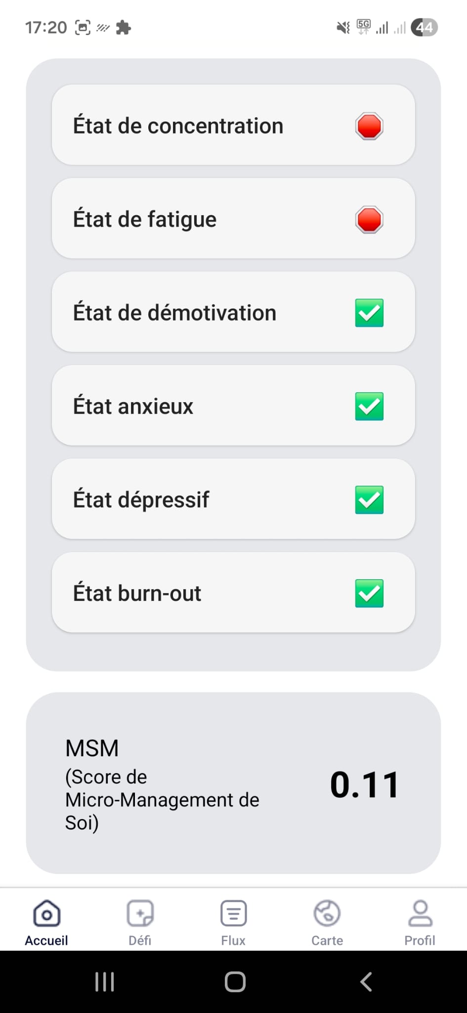 Avec le doigt, parcourez la courbe et cliquez à l’endroit qui représente le mieux le sentiment du moment. Répétez l’action une à trois fois par jour pour avoir des résultats précis. L’app UHLD vous renseigne sur la tendance récente et vous donne aussi des recommandations basées sur vos besoins pour adapter vos ressources à votre environnement à court (une semaine), moyen (un mois) et long terme (une année). Les recommandations vous aident à améliorer votre MSM.